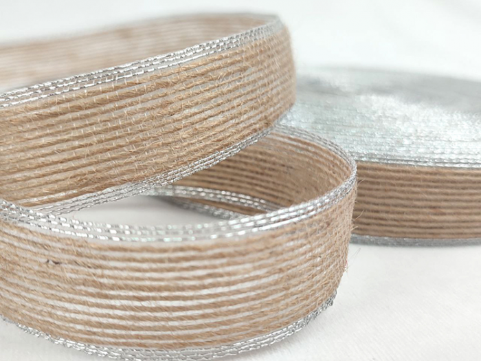 Стрічка джутова 2,5 см, зі срібними краями, 50 м в рул.