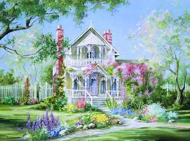 Романтичний будиночок, 50*40см. Набір зі стразами (полотно+тримач)