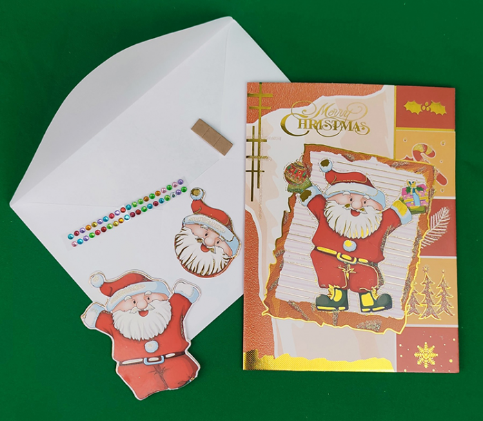 До листівки додаються стрази, вирізані фігурки з паперу і кріплення з пінопласту. Наклеївши їх на листівку, можна отримати об'ємне зображення.