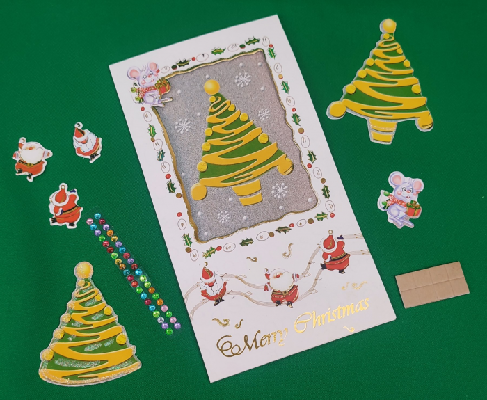 До листівки додаються стрази, вирізані фігурки з паперу і кріплення з пінопласту. Наклеївши їх на листівку, можна отримати об'ємне зображення.